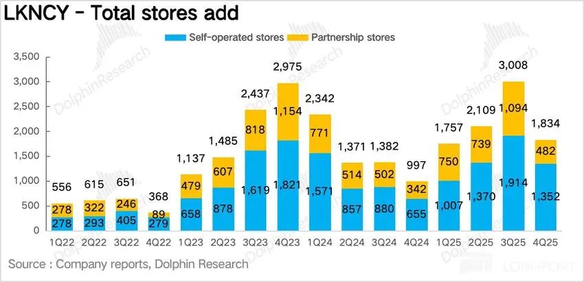 In Q4, Luckin added 1,834 stores, reaching a total of 31,048 stores. The opening speed slowed compared to Q3 but still met the annual target of 8,000 new stores.