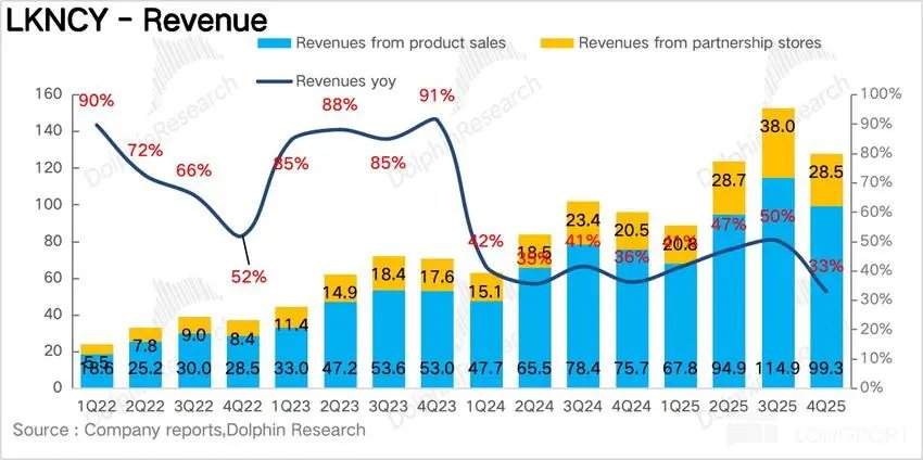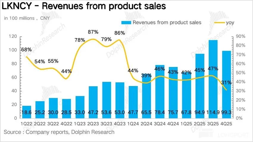 Breaking down: self-operated revenue was 9.9 billion yuan (+31.2%), franchise revenue was 2.85 billion yuan (+39.3%), faster growth than self-operated, mainly due to Luckin lowering franchise thresholds in 2025 to accelerate market penetration.