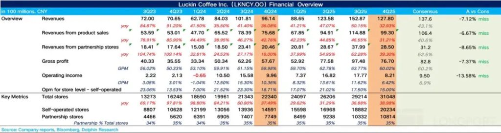 In Q4, Luckin’s total revenue was 12.78 billion yuan, up 32.9% YoY but below expectations.