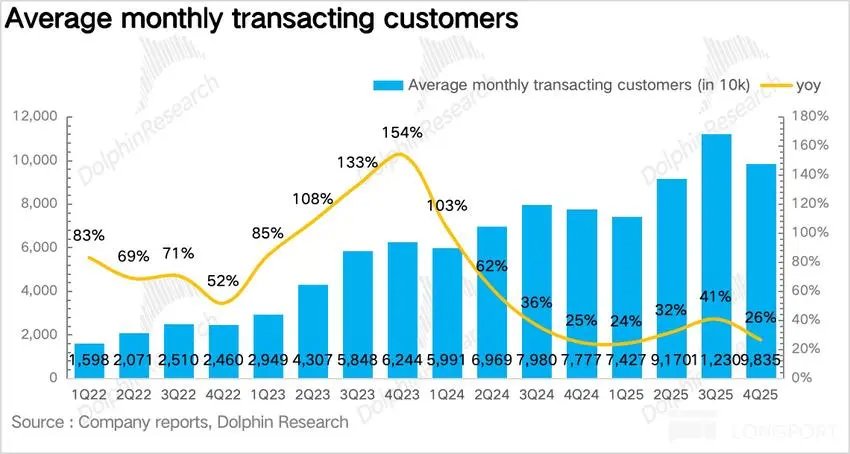 Monthly active paid users growth slowed. In Q4, monthly active paid users reached 98 million, up 27% YoY but significantly slower than Q2 and Q3. I believe this is because, during the takeout war, high subsidies attracted price-sensitive users, but after subsidy reductions, their activity dropped sharply, lowering overall user growth and indicating that private domain retention of takeout users is not high.