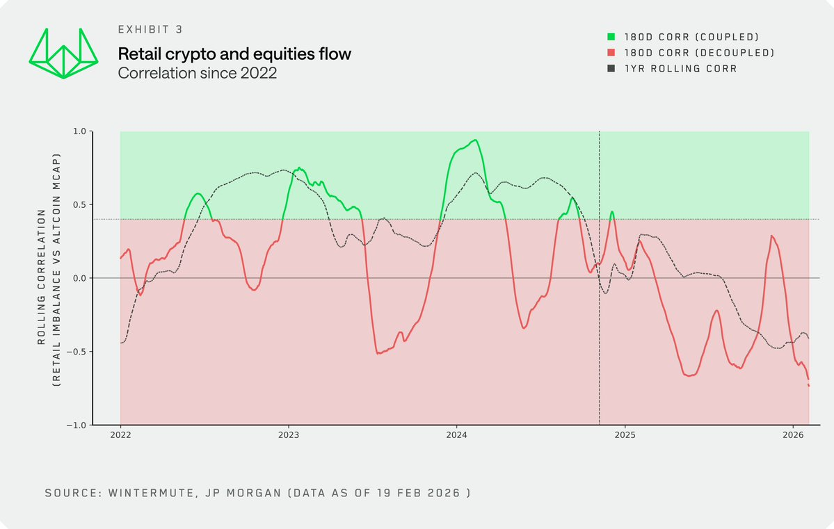 By overlaying Wintermute’s exclusive retail crypto fund flow data with JPMorgan’s retail stock inflow data, we gain a new perspective on the activity relationship between retail investors in stocks and crypto.