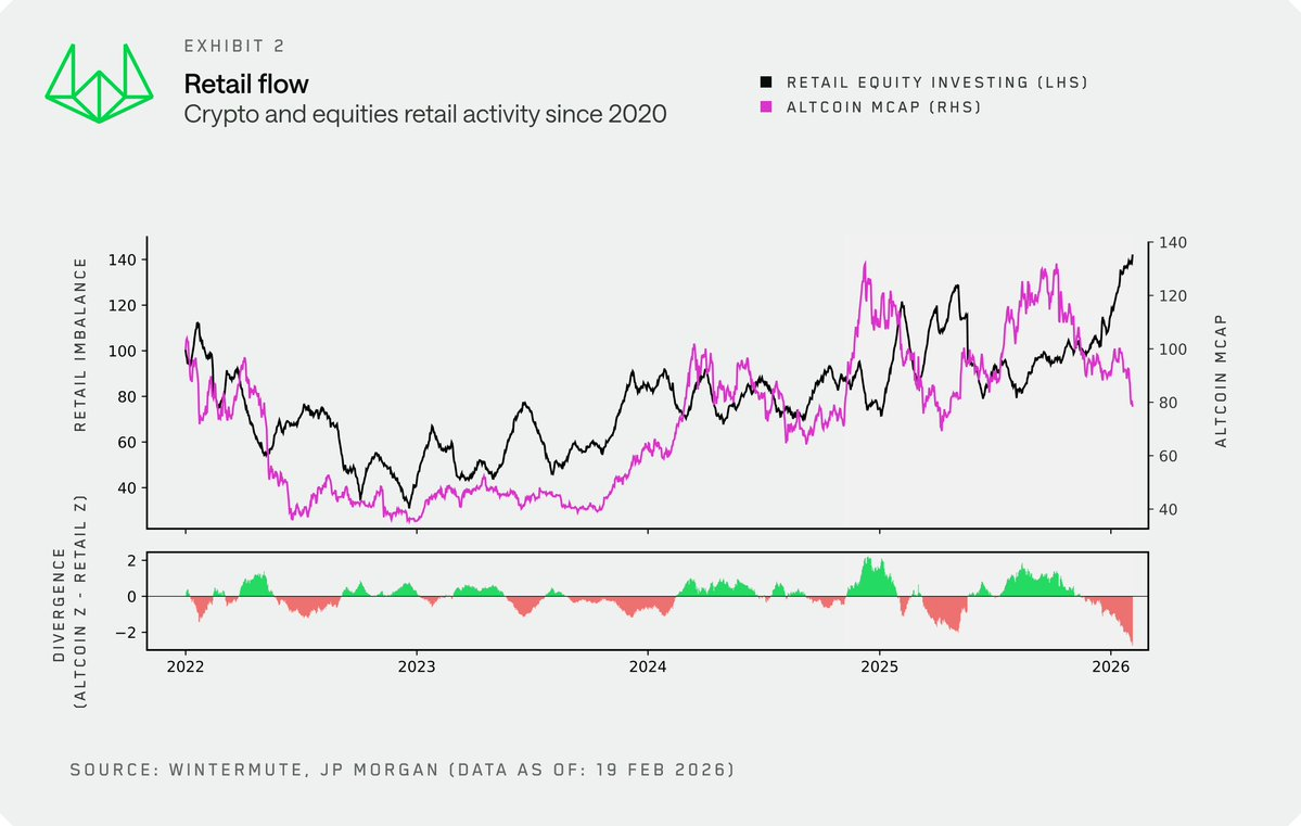 Deep潮 Overview: This article, written by Wintermute OTC traders, provides an in-depth analysis of the fundamental reasons behind the current outflow of retail funds from the crypto market. Historically, crypto bull markets have often been driven by retail speculation, but recent data shows that retail investors are rushing into U.S. stocks at record levels, turning the correlation between crypto and stocks from “synchronous movement” to a “see-saw.” As crypto market volatility declines, entry barriers lower, and AI enhances retail analysis in stocks, cryptocurrencies are no longer the first choice for retail speculation. Understanding this capital rotation helps us readjust multi-asset investment frameworks.