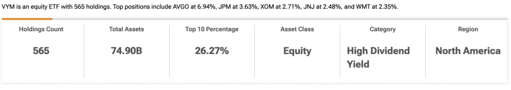 The ETF holds 565 stocks with total assets of $74.90 billion. Its top holdings include Broadcom AVGO -3.19% ▼ , JPM, and XOM.