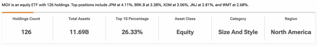 Vanguard Mega Cap Value ETF (MGV) invests in the largest U.S. companies with strong value characteristics, focusing on stocks that appear undervalued relative to fundamentals. It offers investors exposure to high-quality, stable mega-cap companies with potential for long-term capital appreciation and dividend income. MGV has a slightly higher expense ratio of 0.05%.