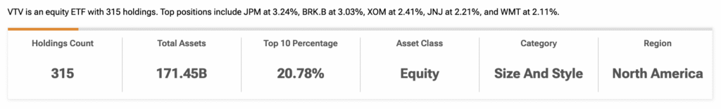 Unlike broader indexes like the S&P 500 or Nasdaq, VTV’s top holdings aren’t mega-cap tech names. Instead, the fund is concentrated in financials, industrials, and healthcare, which make up over 50% of assets. Its three largest positions are JPMorgan Chase JPM +0.93% ▲ , Berkshire Hathaway (BRK.B), and ExxonMobil XOM -0.35% ▼ . Overall, VTV holds 315 stocks with total assets worth $171.45 billion.
