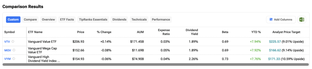Market volatility has defined 2026 so far, with shifting interest-rate expectations, geopolitical tensions, and uneven earnings driving swings across the broader market. While the S&P 500 (SPX) has posted a modest 1.47% year-to-date gain, some ETFs are quietly outperforming. Using TipRanks’ Best Vanguard ETFs tool, we identified Vanguard Value ETF VTV +0.14% ▲ , Vanguard Mega Cap Value ETF MGV -0.08% ▼ , and Vanguard High Dividend Yield Index ETF VYM -0.06% ▼ — each up more than 7% so far this year.