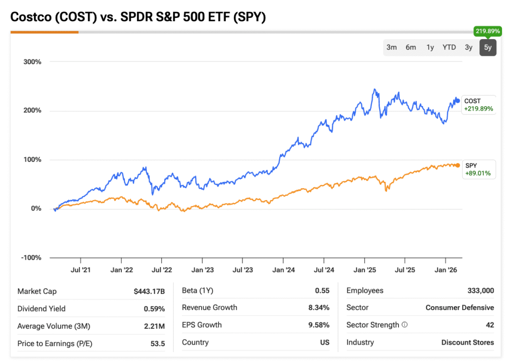 Of course, Costco’s ultra-resilient business model is nothing new to the market—which is precisely why the company has historically traded at such elevated valuations, averaging around 46x trailing earnings over the last five years, more than double the industry average. And because membership fees effectively anchor Costco’s bottom line, even minor fluctuations in new member recruitment or renewal rates become highly sensitive variables when the stock is trading at demanding multiples.