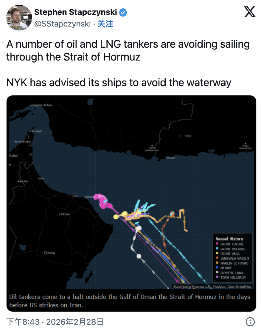 According to Bloomberg journalist Stephen Stapczynski, who obtained data from the port, although the Strait of Hormuz remains open and shipping has not been fully interrupted, an increasing number of oil, refined products, and liquefied natural gas carriers are actively avoiding the area. Stapczynski posted on social platform X: