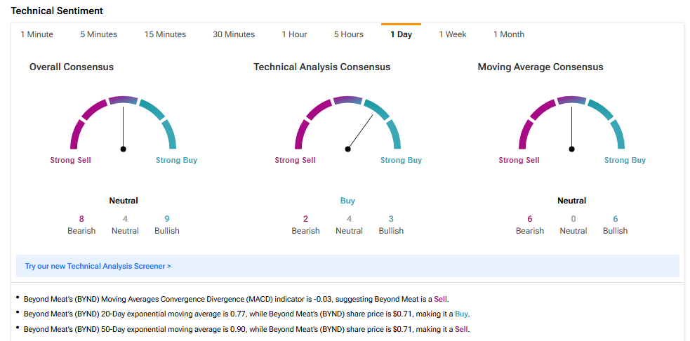 We used TipRanks’ Technical Analysis Tool to assess the outlook for BYND stock. The tool indicates a “Neutral” consensus, with eight indicators showing Bearish signals, four Neutral, and nine Bullish.
