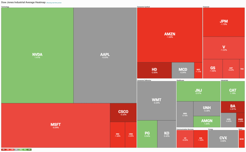 Let’s pivot to TipRanks’ Dow Jones Heatmap, which illustrates the stocks that have contributed to the index’s price action.