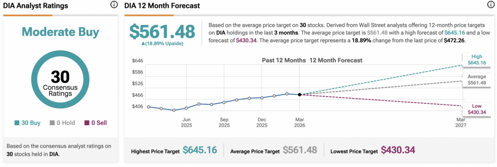 Wall Street believes that DIA stock has room to rise. During the past three months, analysts have issued an average DIA price target of $561.48, implying upside of 18.89% from current prices. The 30 holdings in DIA carry 30 buy ratings, zero hold ratings, and zero sell ratings.