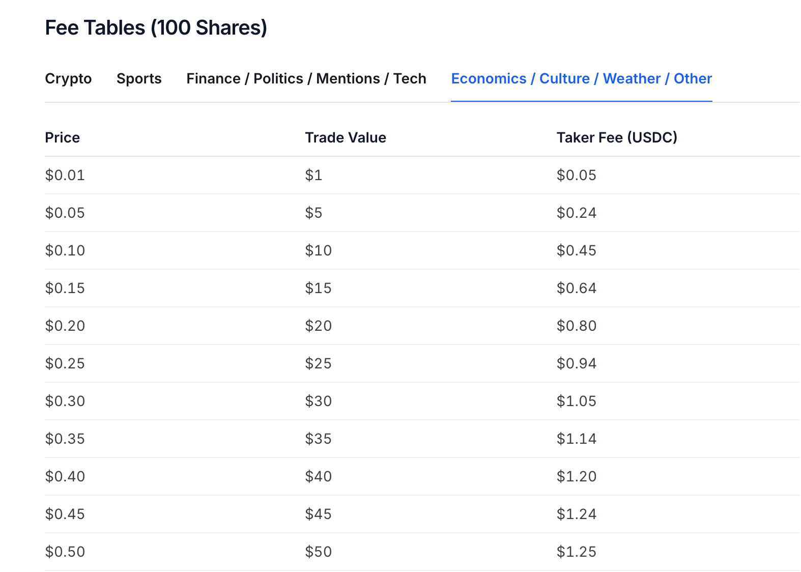 As shown in Polymarket’s official documentation, after the new formula began execution, in the two affected market categories—“weather” and “economy”—the highest fee rate at the extremes has been reduced to 5% so far.