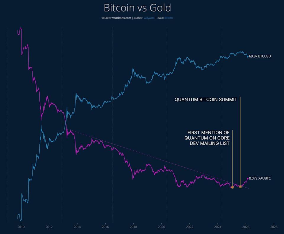 Quantum computing risks are weighing on Bitcoin’s (BTC) relative valuation against gold, according to analyst Willy Woo.