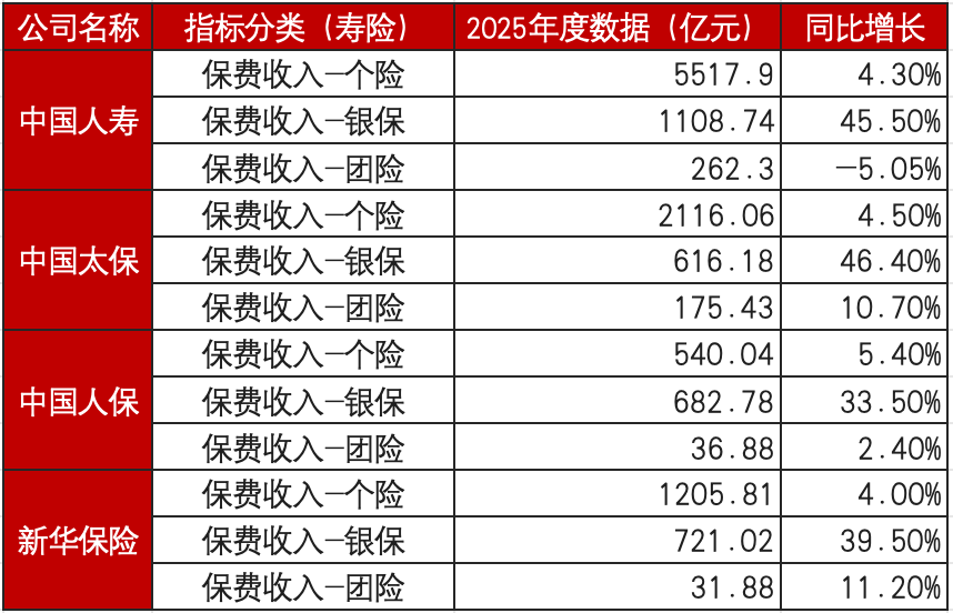 The bancassurance channel became the main bright spot for performance growth in 2025. China Taiping’s life insurance bancassurance channel premium scale was RMB 1.24B, up 46.4%, of which new policy—single premium paid during the new保期缴 period—premiums grew 43.2% year over year. China Life’s bancassurance channel core indicators improved across the board. Total premiums surpassed RMB 100 billion, reaching RMB 200k, up 45.5%; first-year new premiums were RMB 25k, up sharply by 95.7%. New China Life’s bancassurance channel premiums were RMB 72.1 billion, up 39.5%; its new business value contribution had already exceeded that of the individual insurance channel. First-year new premiums from bancassurance reached RMB 37.93 billion, up 52.3%. Wang Lianwen, Vice President of New China Life, said that bancassurance business has become an important engine driving coordinated growth in both scale and value for the company.