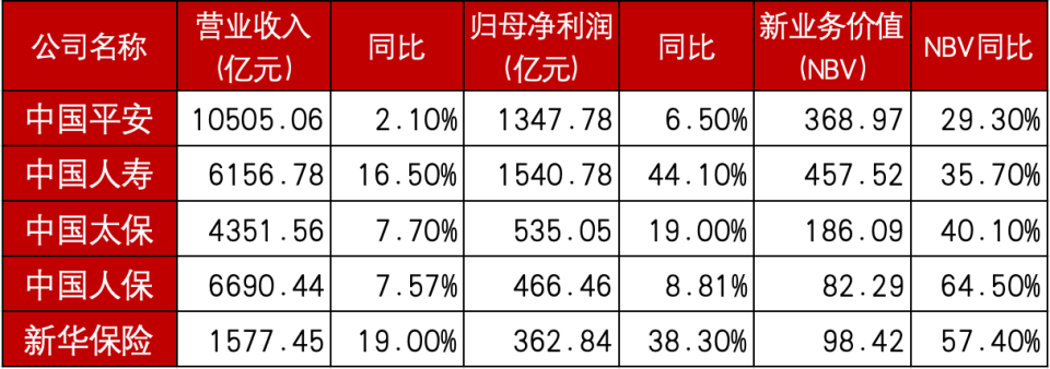 In terms of operating revenue, among the five major A-share listed insurers, China Ping An broke through the RMB 1 trillion mark with RMB 1,050.506 billion, ranking first; China Life recorded RMB 425.29B, ranking second; and New China Life stood at RMB 615.68B, ranking last.