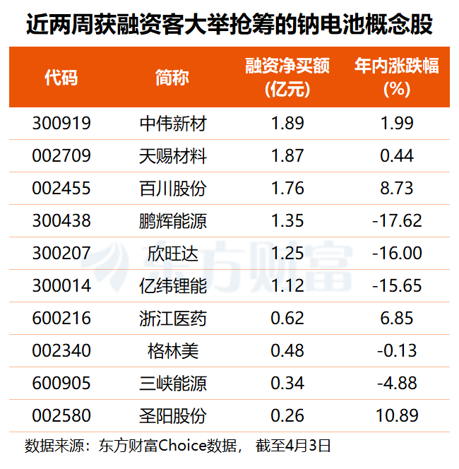 In terms of capital, according to Oriental Fortune’s Choice data, over the past two weeks, 15 sodium-ion battery concept stocks obtained net purchases of financing exceeding RMB 8B each. Among them, CN Wei New Materials and TianCi Materials received incremental additions by leveraged funds of RMB 189 million and RMB 187 million, respectively. Baichuan Shares also saw leveraged investors rush in with RMB 176 million. Penghui Energy, Xinwangda, and EVE Energy all recorded net financing purchases in the range of RMB 112 million to RMB 135 million.