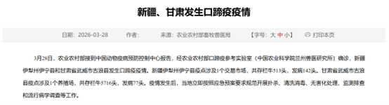 On March 28, 2026, the Ministry of Agriculture and Rural Affairs officially reported that foot-and-mouth disease outbreaks occurred in Yining County, Yili Prefecture, Xinjiang, and Gulang County, Wuwei City, Gansu Province. This was the first time the SAT1 type virus was confirmed within our country.
