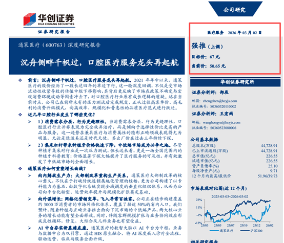Mao Bao Finance reviewed publicly available materials and found that Huachuang Securities issued a comprehensive in-depth research report on Tongce Medical on the evening of March 2. Huachuang Securities stated that, considering Tongce Medical’s brand strength has continued to strengthen in recent years and that it is in a critical stage of strategic transformation, its future earnings have a clear and relatively fast growth outlook. It upgraded its rating from “Recommended” in November 2025 to “Strong Buy,” with a target price of 67 yuan.