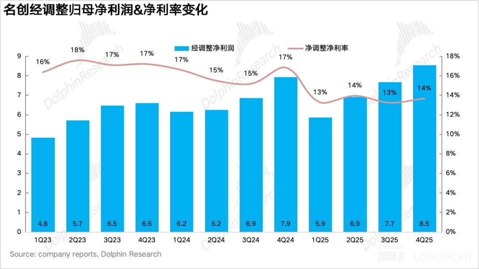 On expense spending: because Miniso is still in the current stage of overseas business expansion (especially in North America), facing large upfront investments such as opening stores (store openings accelerated in Q4), personnel hiring, and brand promotions, the sales expense ratio rose significantly by 5.3% year over year to 26.5%. The management expense ratio was roughly flat. Ultimately, in 4Q25 Miniso achieved adjusted net profit of RMB 850 million, up 7.7% year over year, slightly below expectations.