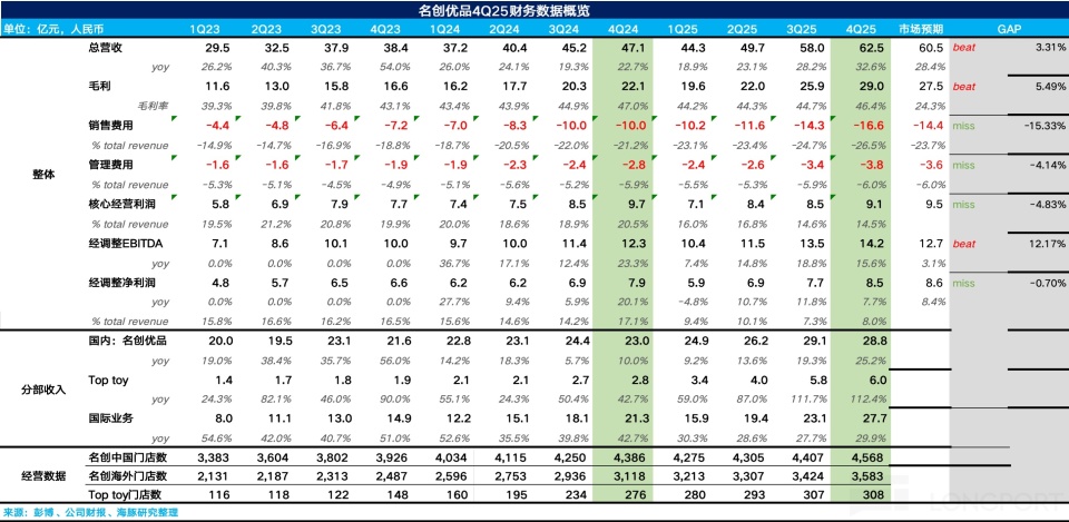 1、Revenue exceeded the upper bound of guidance: In 4Q25, Miniso Group achieved total revenue of RMB 6.25 billion, up 32.6% year over year, exceeding the 20%-25% guidance the company provided in the prior quarter. Breaking it down, benefiting from the full implementation of the Miniso big-store strategy and the impact of the November 《Zootopia 2》 collaboration, Q4 domestic same-store revenue returned to double-digit growth. Miniso main brand revenue grew 25.2% year over year and accelerated sequentially. Top Toy, driven by breakout IPs such as Miangmi’er, grew 112% year over year, continuing the strong growth seen in Q3.