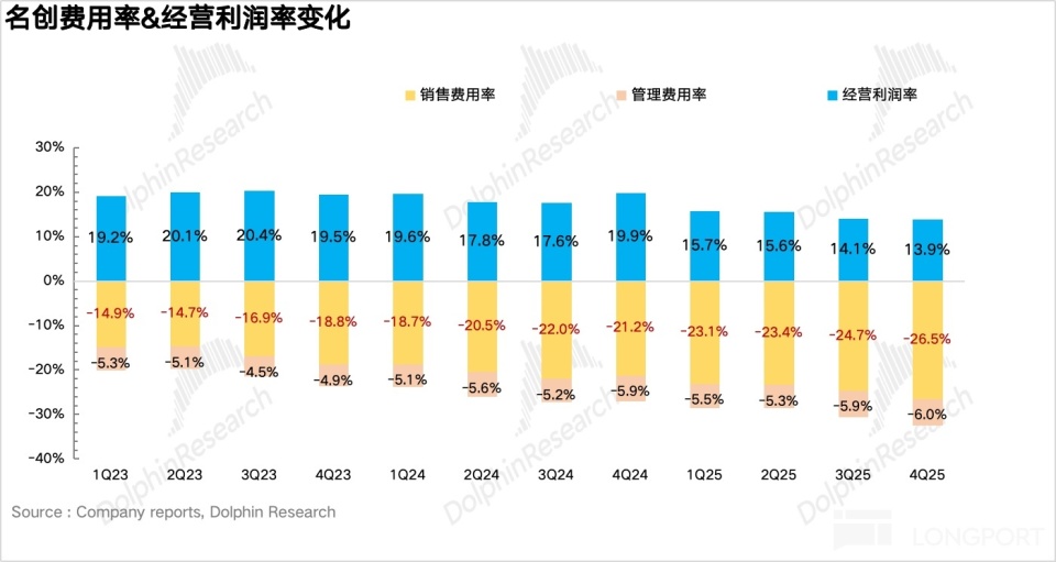 4、Expense ratios still rising, and profit release falling short of expectations. On expense deployment, because Miniso is still in the overseas business expansion phase (especially in North America), facing large upfront investments such as opening many stores, hiring personnel, and running brand promotions, both the sales expense ratio and the general and administrative expense ratio increased in Q4. Ultimately, in 4Q25 Miniso achieved adjusted net profit of RMB 850 million, up 7.7% year over year, slightly below expectations.