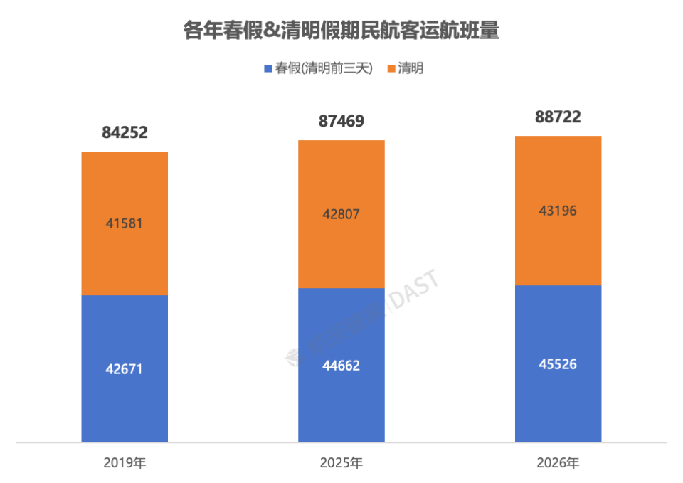 According to DAST traffic data express, during the 2026 Spring Festival holiday & Qingming Festival (6 days), civil aviation operated 88.7k passenger flights, averaging 12,675 flights per day. Compared with 2025, this is up 1.4%, and compared with 2019, up 5.3%. By time period, during the first three days of Qingming, the year-over-year increase was 1.9%, and the increase versus 2019 was 6.7%; during the Qingming period, the year-over-year increase was 0.9%, and the increase versus 2019 was 3.9%. The growth during the Qingming holiday is lower than the growth during the Spring Festival holiday.