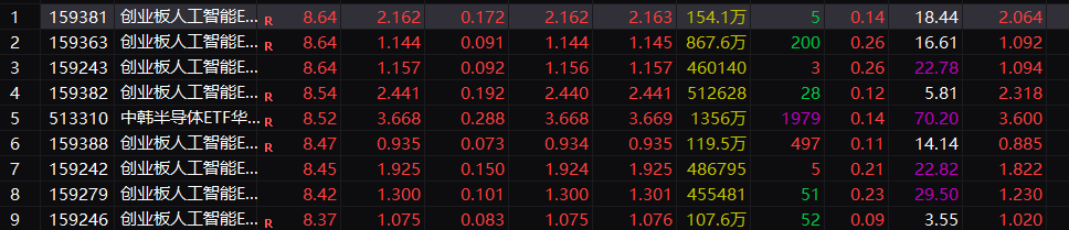 Specifically, let’s look at the heat in the artificial intelligence sector. This afternoon, most AI ETFs are up more than 8%. The STAR 50 Index’s gain widened to 6%, and all constituent stocks are up. This seems to match a strong return of popularity across the entire track.