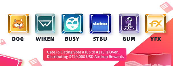 DOG, WIKEN, BUSY, STBU, GUM, YFX #Voting for Listing# campaigns completed and these tokens have successfully listed on Gate. We have rewarded users with token airdrops, and enabled trading and withdrawal services. #Voting for Listing# is currently on! Please stay tuned for more activities: https://www.gate.io/en/poll