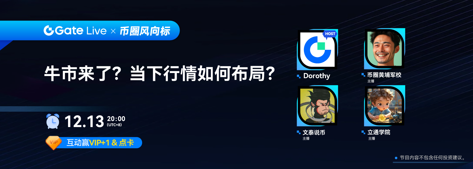 GateLive将于12月13日20:00(UTC+8)举办直播栏目《币圈风向标》。我们将邀请三位平台主播参与其中,共同探讨当下行情应如何布局。
