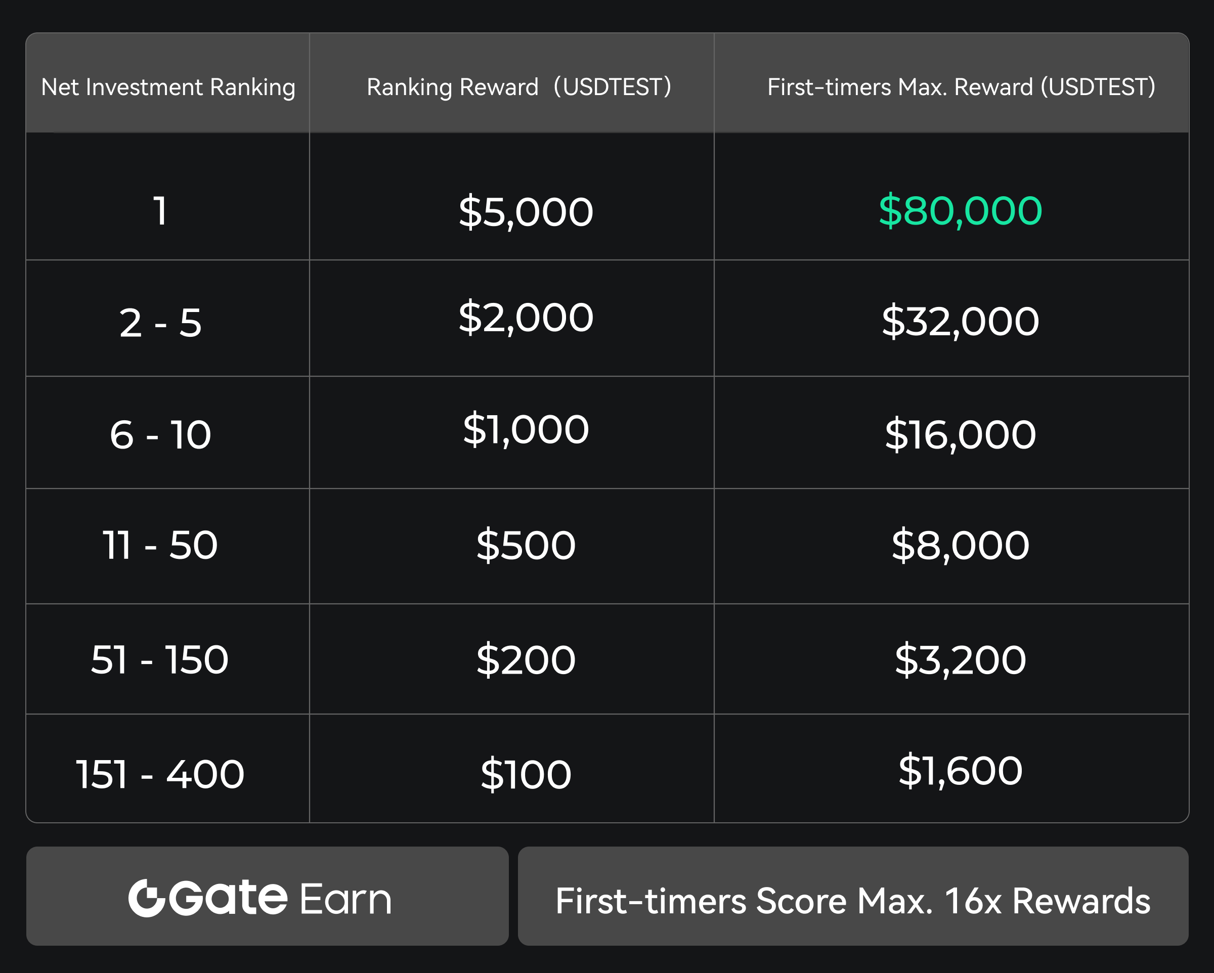 O Desafio de Classificação de Cripto Top do Gate Simple Earn está agora ativo. Registe-se agora para subscrever os produtos flexíveis e fixos USDT, BTC, ETH do Simple Earn e os 400 melhores utilizadores com base em investimentos líquidos irão partilhar um prémio de um milhão de dólares. Os utilizadores do Simple Earn pela primeira vez podem desfrutar de um multiplicador de bónus até 16 vezes, com a possibilidade de ganhar até $80,000 USDTEST.
