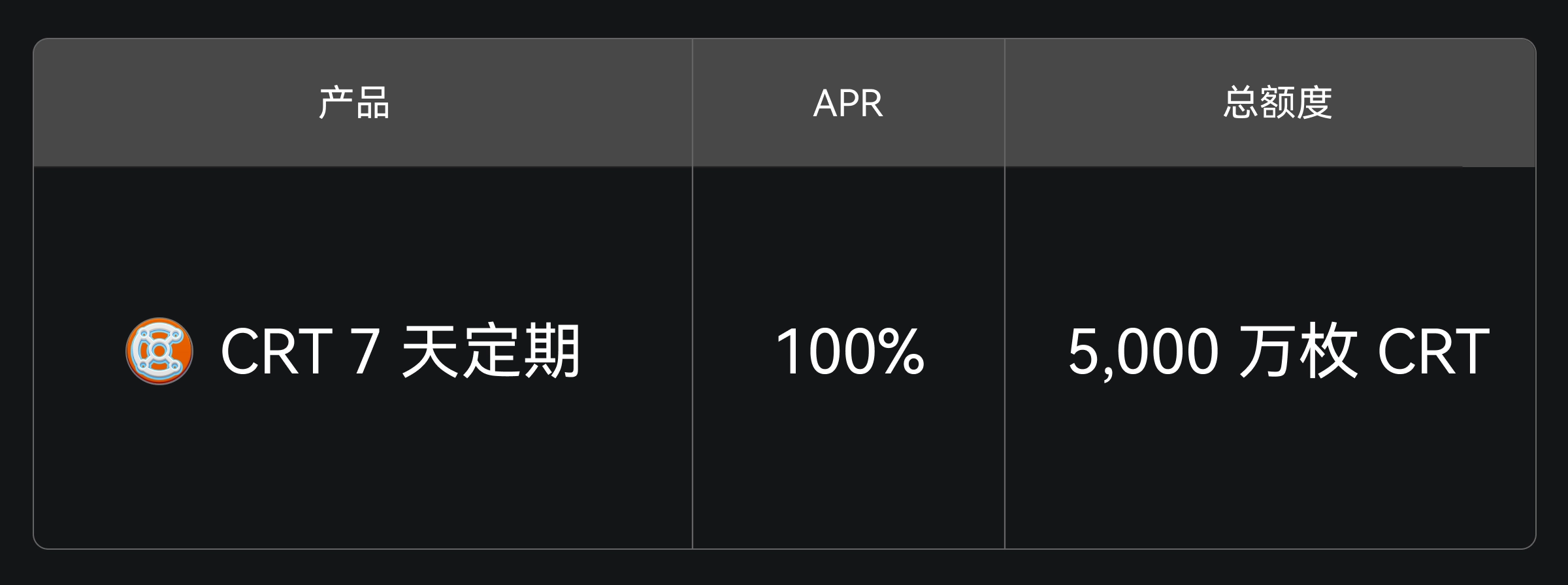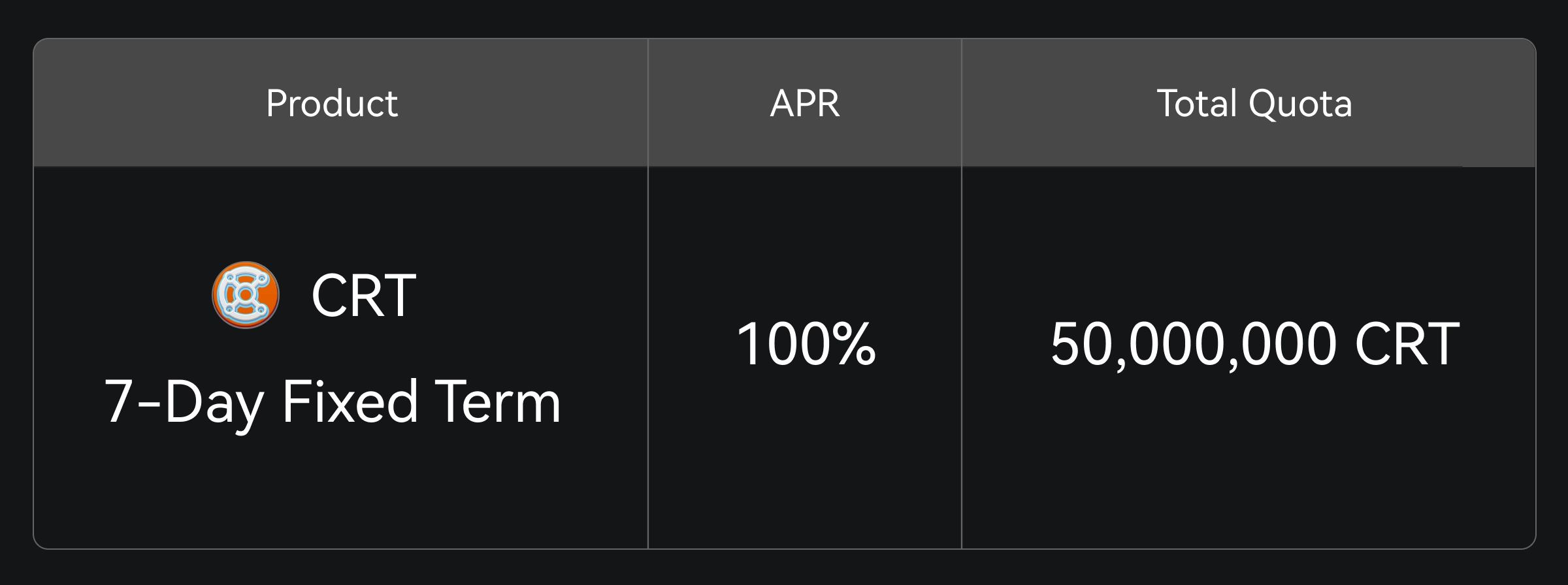 O Gate Simple Earn lançou o investimento fixo de 7 dias em CRT, oferecendo até 100% APR. Com uma alocação limitada de 50 milhões de CRT disponível por ordem de chegada, não perca.