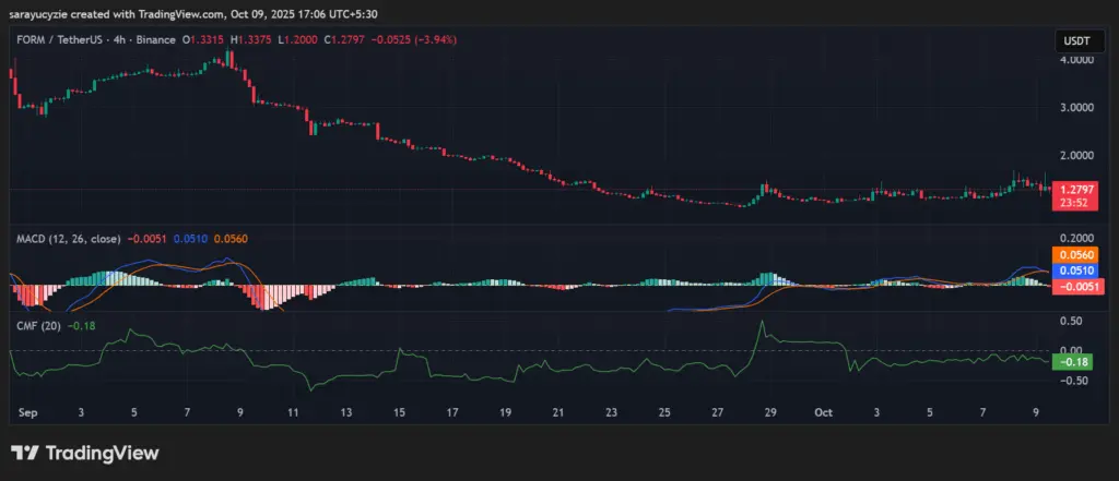 *FORM gráfico (Fonte: TradingView)*Além disso, a linha de Convergência e Divergência da Média Móvel (MACD) de Quatro está abaixo da linha de sinal, o que indica um momento de baixa. A tendência recente de preços do ativo está enfraquecendo, e os vendedores podem estar no controle. O Fluxo de Dinheiro de Chaikin (CMF) do FORM está posicionado em -0.18, sugerindo que a pressão de venda está dominando o mercado. O dinheiro está saindo do ativo, em vez de entrar.