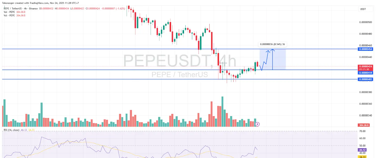 PEPE/USDT atualmente parece uma borracha que foi esticada demais e agora começa a voltar à sua posição normal, o preço bateu no suporte forte 0.00000402 e tenta se mover de forma estável acima da área entry 0.00000418, indicando que os compradores estão começando a aparecer novamente. Enquanto esse nível básico se mantiver, a oportunidade de alta em direção ao take profit 0.00000454 ainda está aberta, pois o RSI que antes estava fraco agora está lentamente subindo, mostrando que a pressão de venda está começando a diminuir.