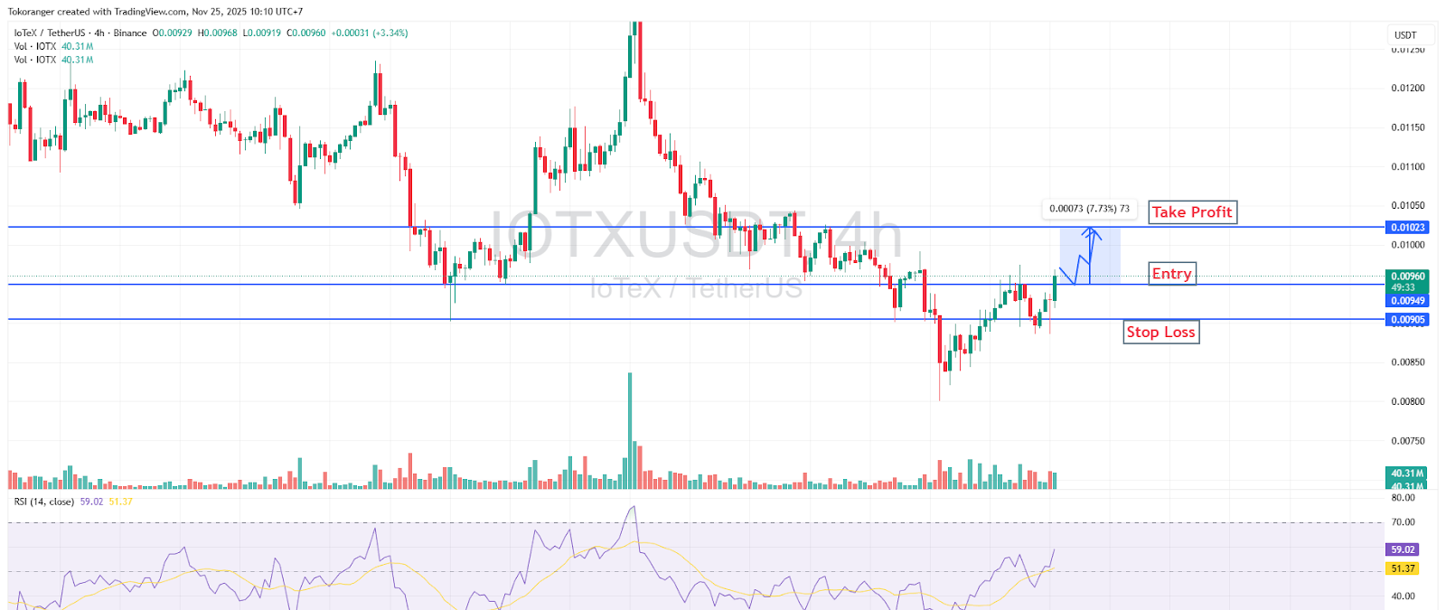 IOTX está mostrando uma fase de recuperação bastante saudável após um forte rebote da área support 0.00905, um nível que anteriormente já foi três vezes uma zona de defesa importante. O preço agora está se movendo para cima, aproximando-se da área entry 0.00949, que também se torna o limite inicial para ver se este momento bullish é forte o suficiente para continuar.