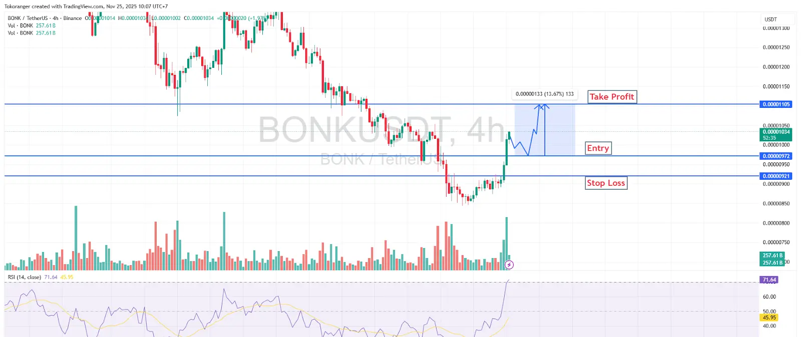 Enquanto o BONK conseguir manter-se acima desse suporte, as chances de uma viagem até a área de take profit 0.00001105 são altas, especialmente porque o RSI, que chegou a tocar a zona de sobrecompra, indica que o interesse de compra voltou a estar ativo.