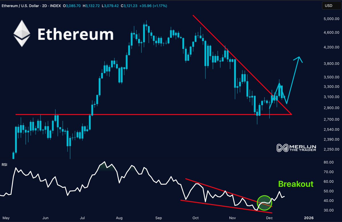 A ação do preço também se está a enrolar acima de uma faixa de suporte importante em torno de $3,000–$3.1k. Manter esta zona é essencial. Enquanto o Ethereum se mantiver acima de $3.1K, a análise sugere que um movimento em direção a $3.4K se torna provável. Isto está alinhado com a formação de triângulo em estreitamento visível no gráfico de dois dias, em que o preço continua a subir aos poucos após rejeitar a fronteira inferior no início deste mês.
