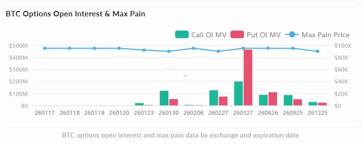 Opções de venda concentradas perto de $95.000, alinhadas com o ponto de máxima dor