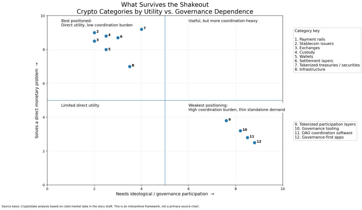 Categorias de criptomoedas classificadas por utilidade monetária direta e dependência de governança, colocando as vias de pagamento e as stablecoins acima do software focado em governança.