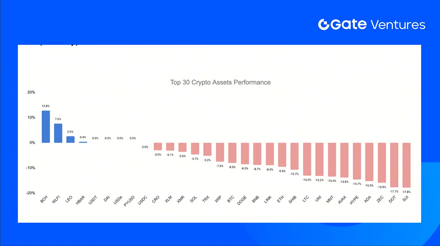 Среди 30 лучших крипто-активов цены упали в среднем на 9,8% за неделю. Только BCH, WLFI и LEO смогли показать рост.