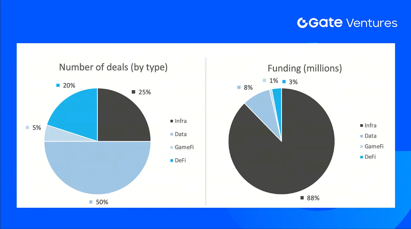 Количество сделок, закрытых на прошлой неделе, составило 20, из которых Data заключила 10 сделок, что составляет 50% от общего числа сделок. В то же время, Infra заключила 5 (25%), GameFi - 1 (5%), а DeFi - 4 (20%).