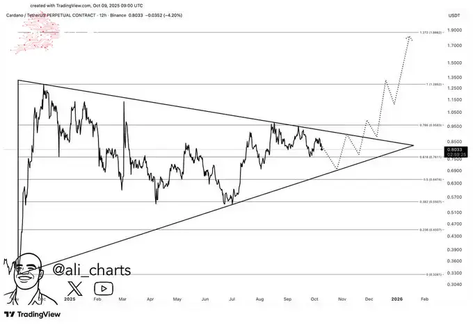 Согласно известному криптовалютному аналитику Али Мартинесу, прогноз основан на консолидации ADA в рамках большого симметричного треугольника на протяжении большей части 2025 года — формации, которая, как правило, предшествует сильному направленному движению.