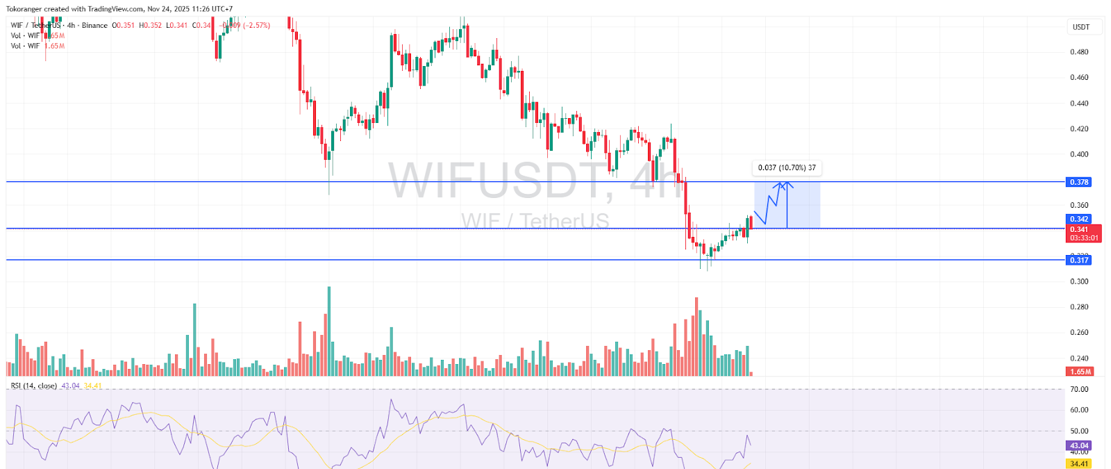 WIF/USDT в настоящее время как “только что проснувшийся от долгого сна” после сильного отскока от области поддержки 0.317, где давление продаж ранее начало ослабевать. Увеличение зеленого объема и RSI, который начал расти с уровня перепроданности, дают первоначальный сигнал о том, что покупатели начинают брать верх. Пока цена остается выше зоны входа 0.342, возможности роста к сопротивлению 0.378 широко открыты как ближайшая цель для получения прибыли.