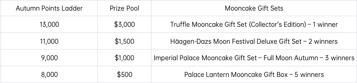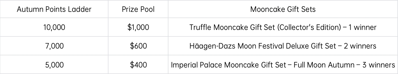 Users who meet the Autumn Points Ladder requirements can share the corresponding prize pool based on their total points ratio and participate in the lottery for mooncake gift sets within the respective tier.