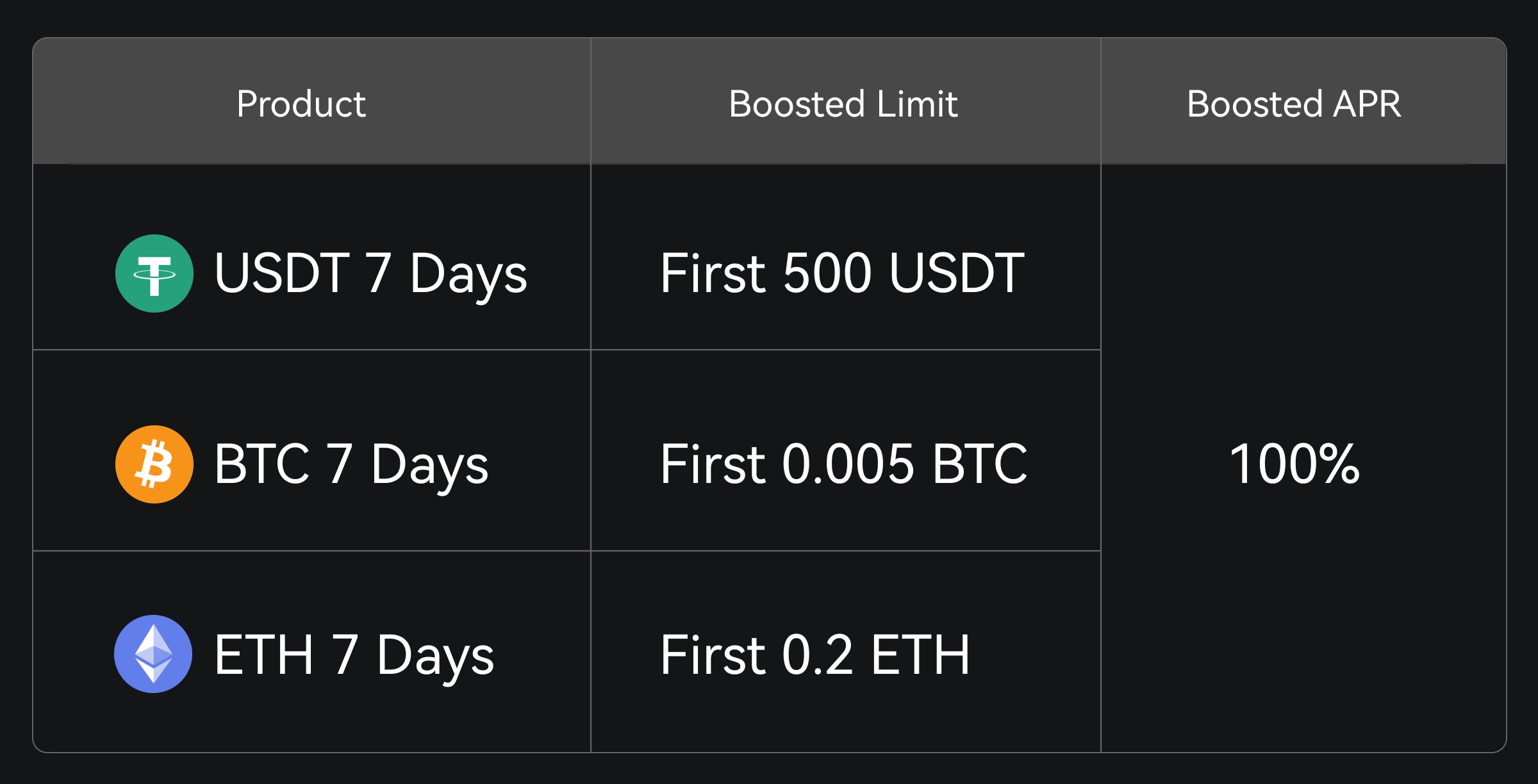 1. If you subscribe to a 7-day USDT fixed-term product with 3,000 USDT, in addition to the base APR of 2.5%, the first 500 USDT will receive an extra 100% APR boost. The same calculation applies to BTC and ETH.