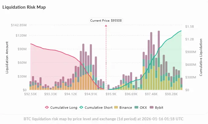 • Upside Liquidation: Around $95,800, with a cluster of $11.5 million shorts; breaking $98,671 could trigger $1.4 billion in short liquidations.