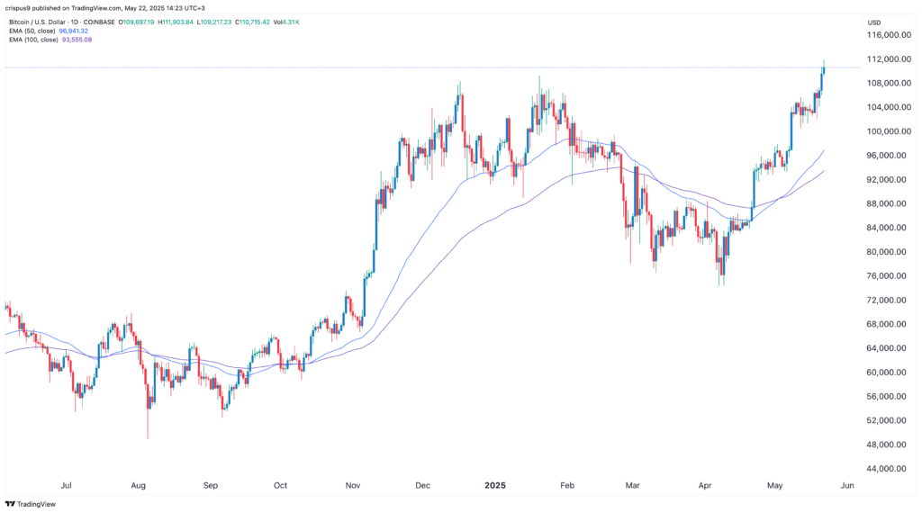 Ціна біткойна залишається на висхідному тренді, стабільно утримуючись вище психологічно критичної зони в 110 000 доларів США Фактично, як видно на його щоденному графіку, криптовалютний мейджор сформував бичачий патерн «Три білі солдати»; підняв ціну біткоїна до нового історичного максимуму в $111 881 на початку сесії в четвер. Настрої щодо ризику утримують биків під контролем: індекс криптостраху та жадібності зріс з рівня жадібності на попередній сесії з 68 до 69