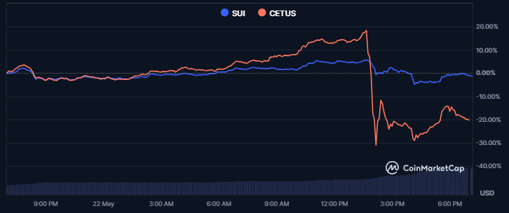 У той же час CETUS впав з 0,2556 долара до 0,1488 долара, втративши понад 40% через кілька хвилин після злому.