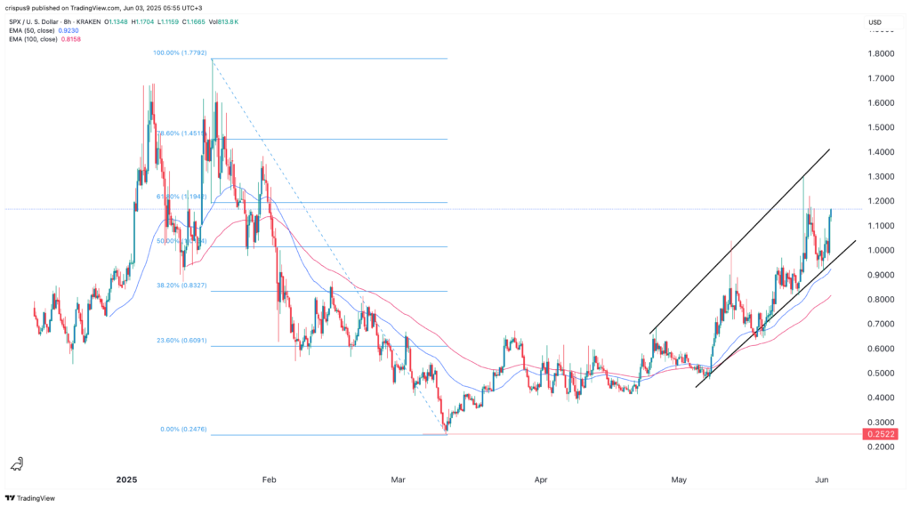 Ціна токена SPX6900 зросла за останні кілька місяців, що зробило його однією з найуспішніших криптовалют. SPX виріс на 360%, піднявшись з мінімуму $0.2522 у березні до $1.1587.