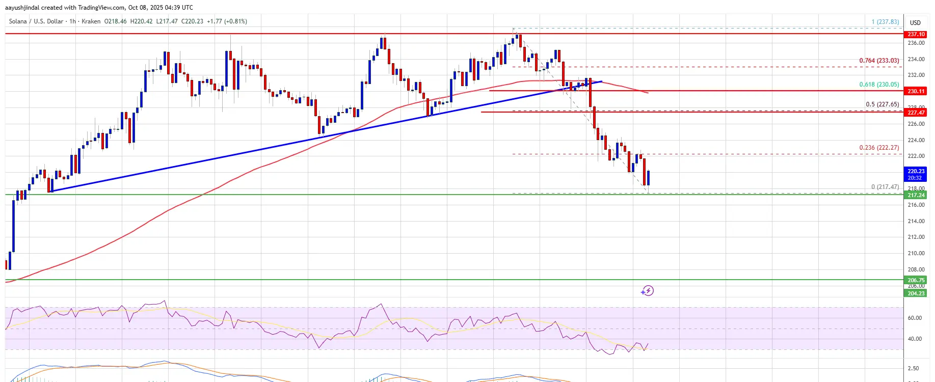 Відбувся рух нижче $232. Крім того, сталося прорив нижче ключової бичачої трендової лінії з підтримкою на $230 на годинному графіку пари SOL/USD. Пара торгувалася на рівні до $217.47 і наразі консолідує втрати нижче рівня корекції Фібоначчі 23.6% нещодавнього падіння від $237 максимуму до $217 мінімуму.