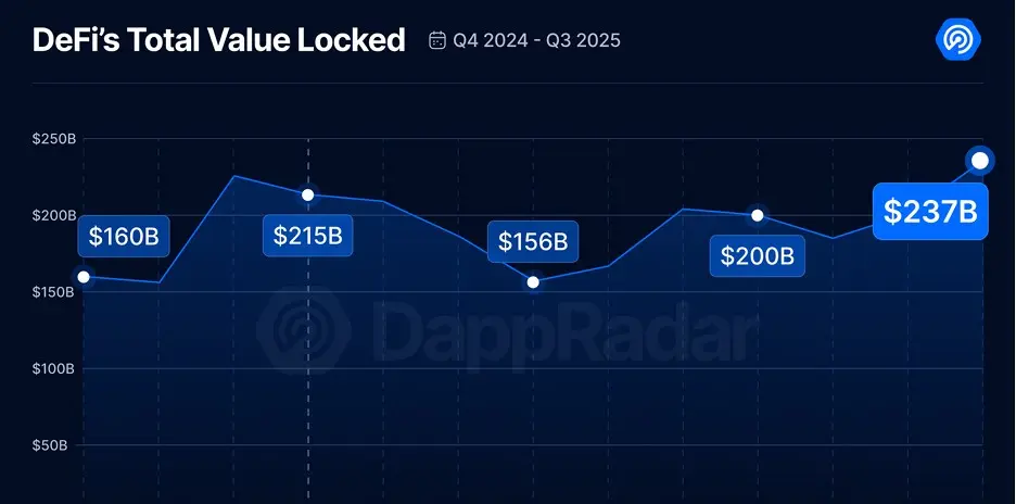 DeFi TVL досягає рекорду $237B , оскільки кількість активних гаманців щодня падає на 22% у Q3: DappRadar